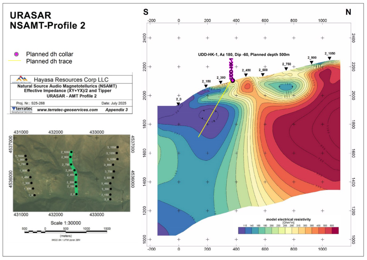 Joel Sutherland, CEO of Hayasa, comments, “The final Urasar drill hole of 2025 is a deeper hole that is meant to dissect the anomaly identified in the AMT survey completed mid-summer 2026 (see Figure 2). We have a lot more data on Urasar than we did a year ago and we will drill until the weather turns.