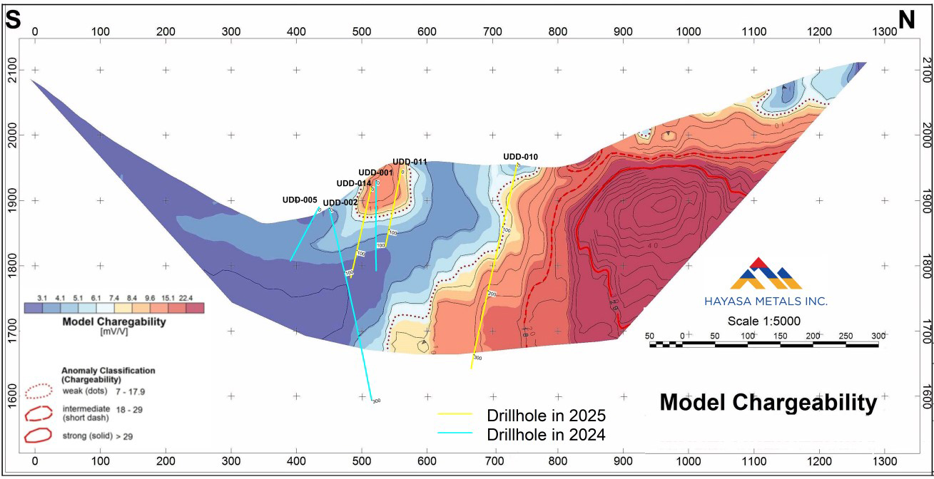 Dennis Moore, President and Qualified Person of Hayasa, commented: “These latest results confirm the presence of short but well-mineralized intervals within the Black River and Oxide Basin prospects. All holes intersected broad zones of strongly to intensely altered volcanics and breccias, as well as pervasive sulfide mineralization, including a 25-meter interval of massive sulfide in hole UDD-017 between 45 and 70 meters depth.