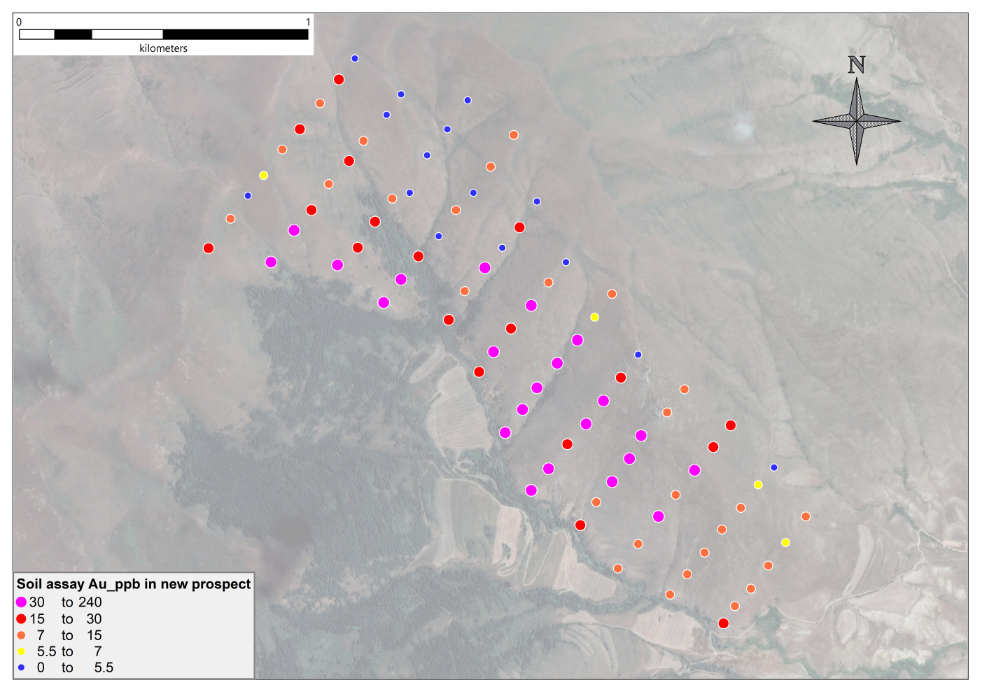 A gold-mineralized area identified by our local team in previous field seasons has shown promising results. Geochemical sampling indicates encouraging gold values, covering a 2,200m by 800m surface area, carried out on lines 200m apart earlier this year, as illustrated in the image below. The application process is currently underway, and further details will be provided once the exploration permit is granted.