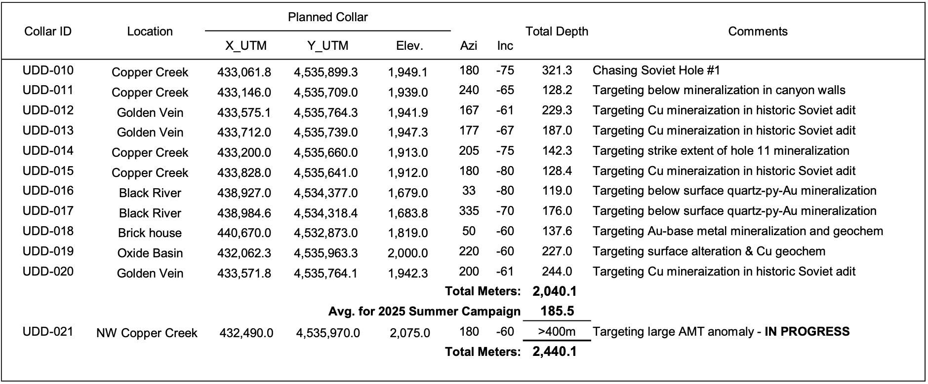 The Phase 2 summer 2025 diamond drilling program comprised 11 holes totaling over 2,040 meters completed over June and July 2025. We have added an additional hole, UDD-021, targeting an AMT conductivity anomaly northwest of Copper Creek, which is currently in progress (see Hayasa News Release dated October 28, 2025). The first batch of drill results was released on October 14, 2025. Hole UDD-021 is expected to be completed within the next ten days, with analytical results anticipated in early 2026.